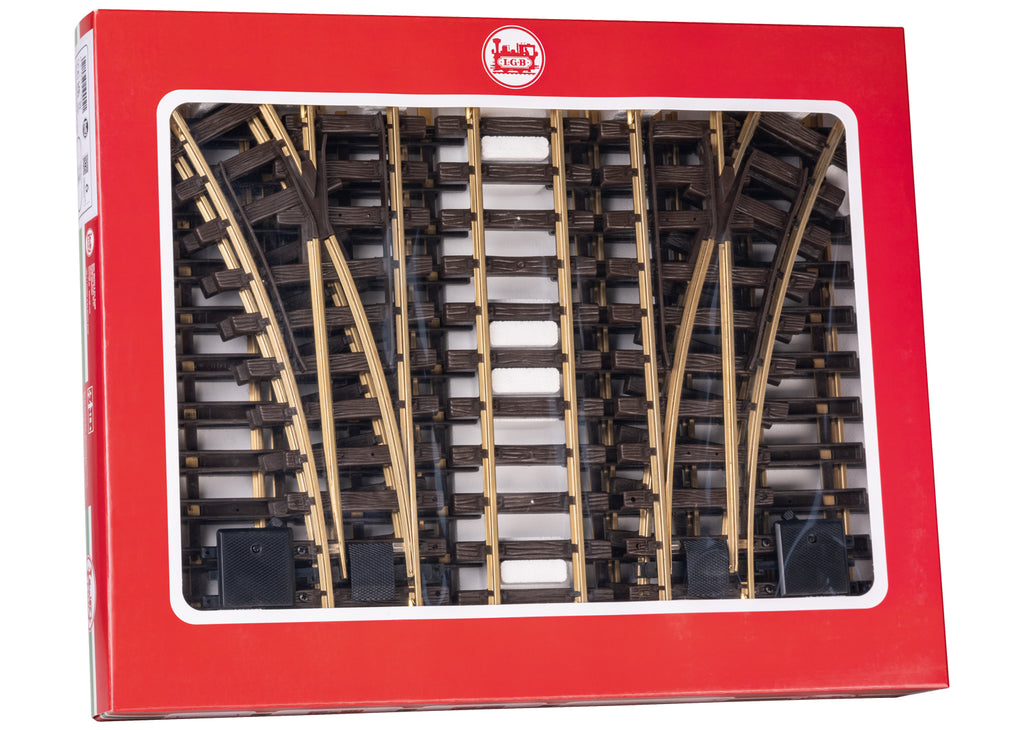 You can enlarge your LGB starter set circle into an oval with a passing track. Two trains can pass, one train can park, cars can be switched or a locomotive can be moved from one end of the train to the other. The sturdy storage box includes: 1 - 12000 manual right-hand switch, 1 - 12100 manual left-hand switch, 9 - 10000 straight track sections, 2 - 11000 curved track sections.