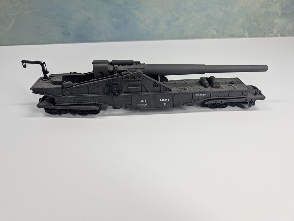 In overall nice condition. The wheel to move the cannon is stiff. Knuckle couplers installed. May have paint wear/scratches/scuffs. Might require some light cleaning.
