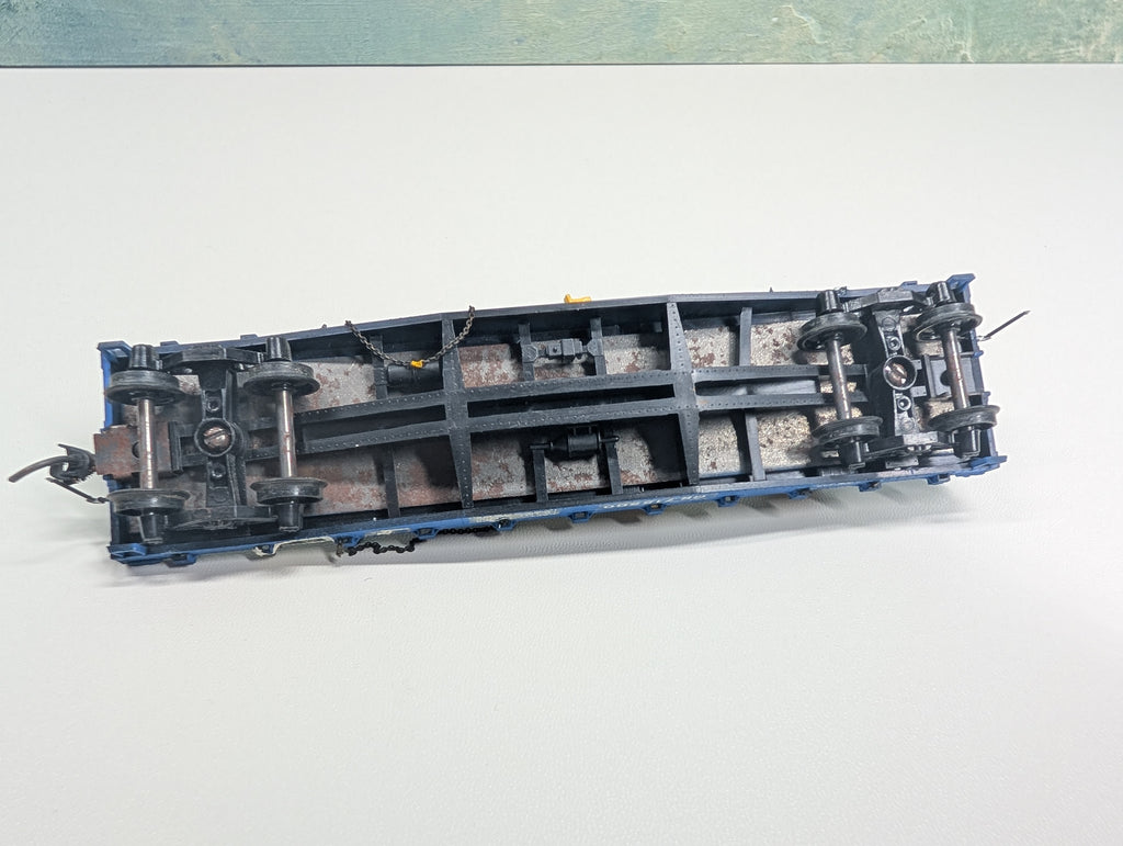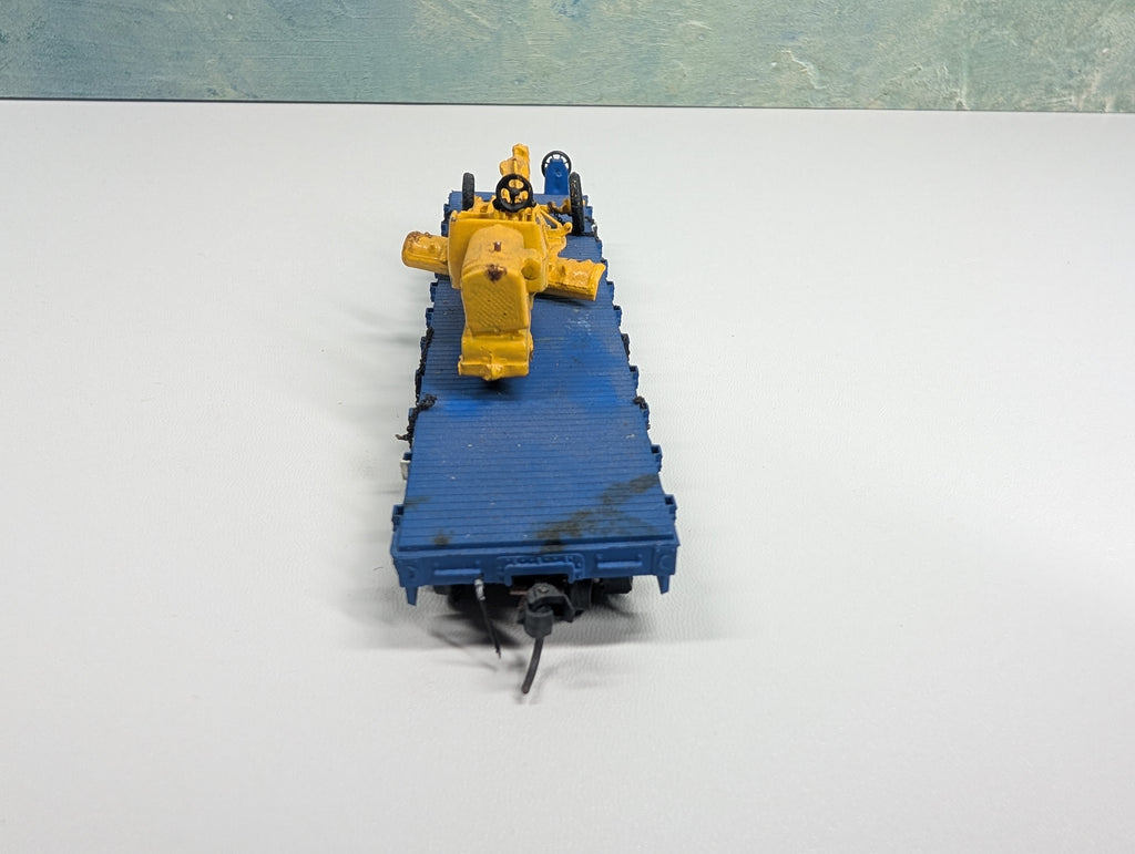 The flat car itself is in nice condition. It is decalled and the decals are flaking off. The Construction Load is metal and some of the wheels are included to be repaired. Missing a coupler/gearbox cover. Knuckle couplers installed. May have paint wear/scratches/scuffs. Might require some light cleaning.