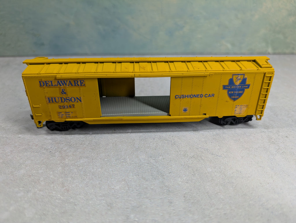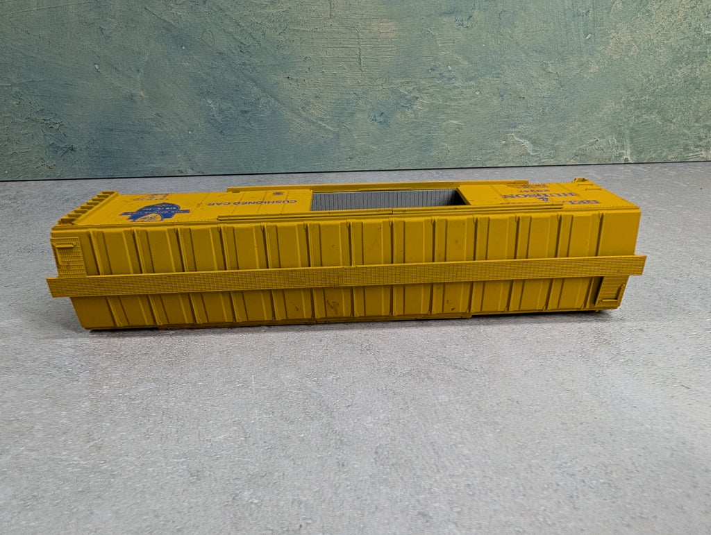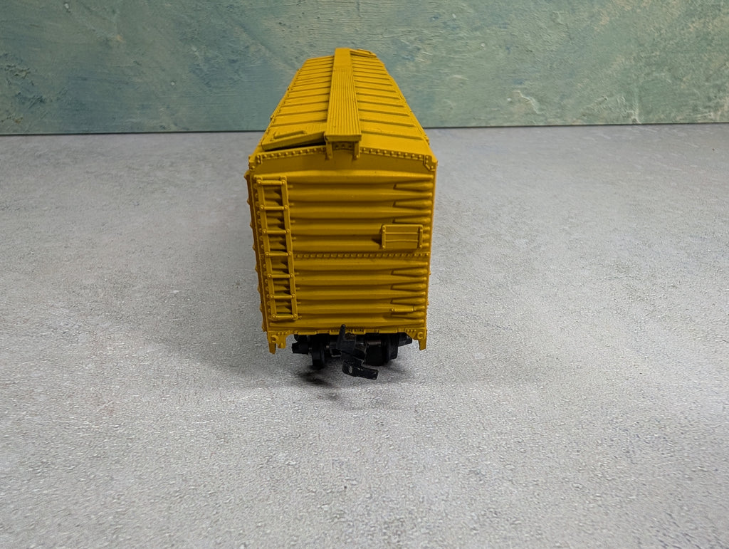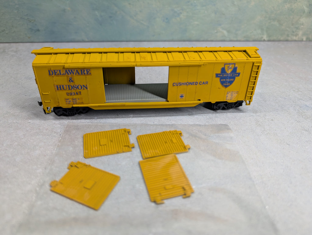 In good condition. Doors need to be installed. Rust on bottom metal. No brake wheel. Horn Hook couplers installed. May have paint wear/scratches/scuffs. Might require some light cleaning.