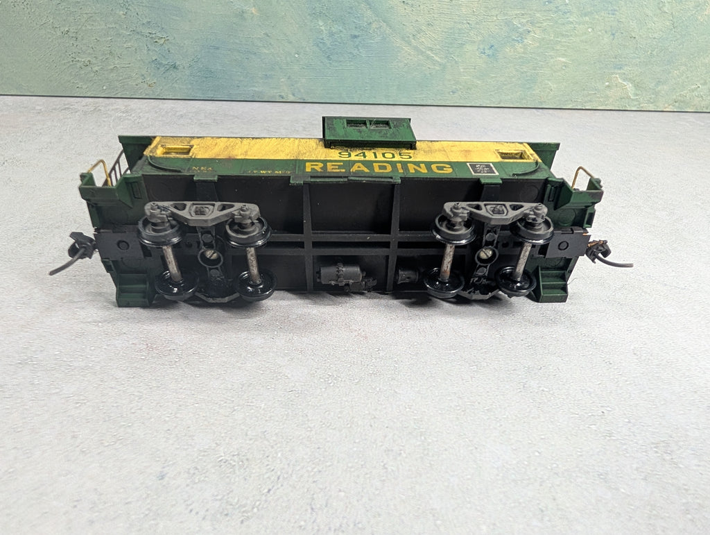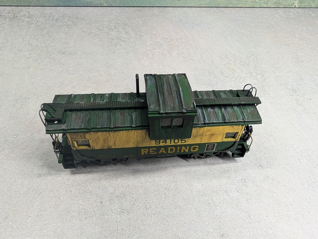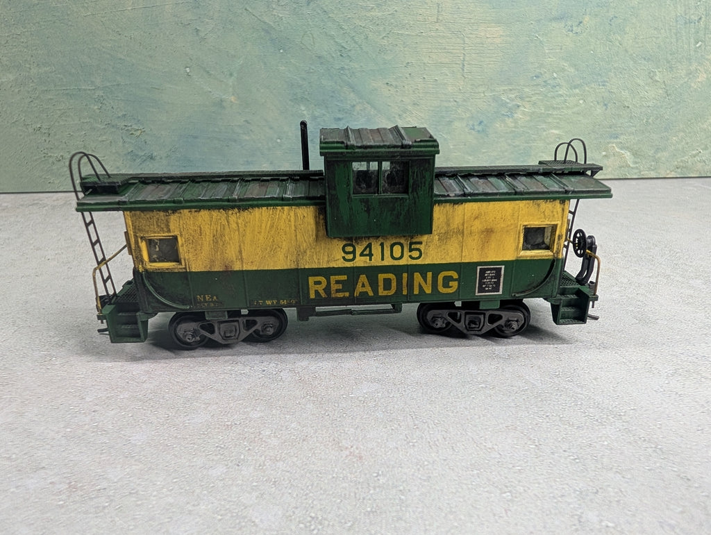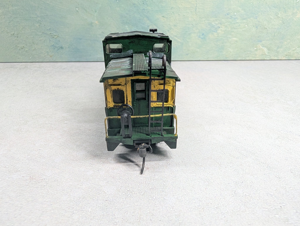 Has knuckle couplers. The weathering looks great. Missing some window panes. Some paint wear/scratches/scuffs. Might require some light cleaning.