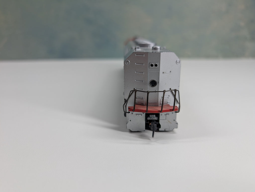 Tested and runs great. The headlight works. The number boards don't light up. The front rail is included to be installed, it has glue residue on it from previously being glued on the front. The front of the shell has a small crack that was previously repaired with glue, but may need further repairs. May need some work to make it look nice. Frame is a little loose. Knuckle couplers installed. Does not include box. May have paint wear/scratches/scuffs. Might require some light cleaning.