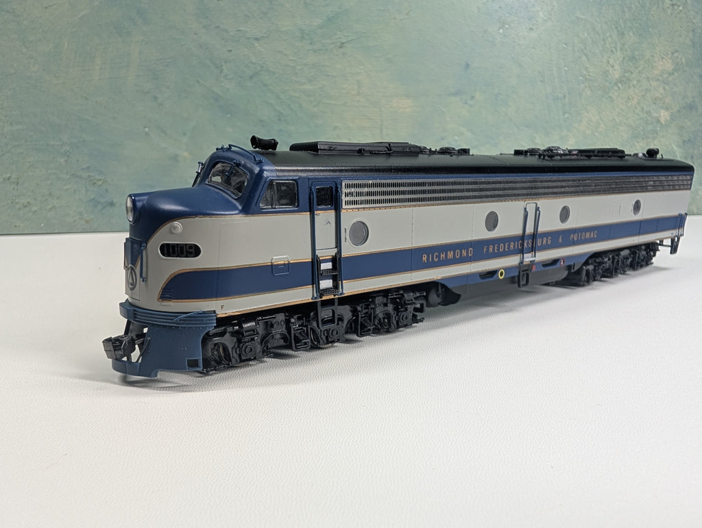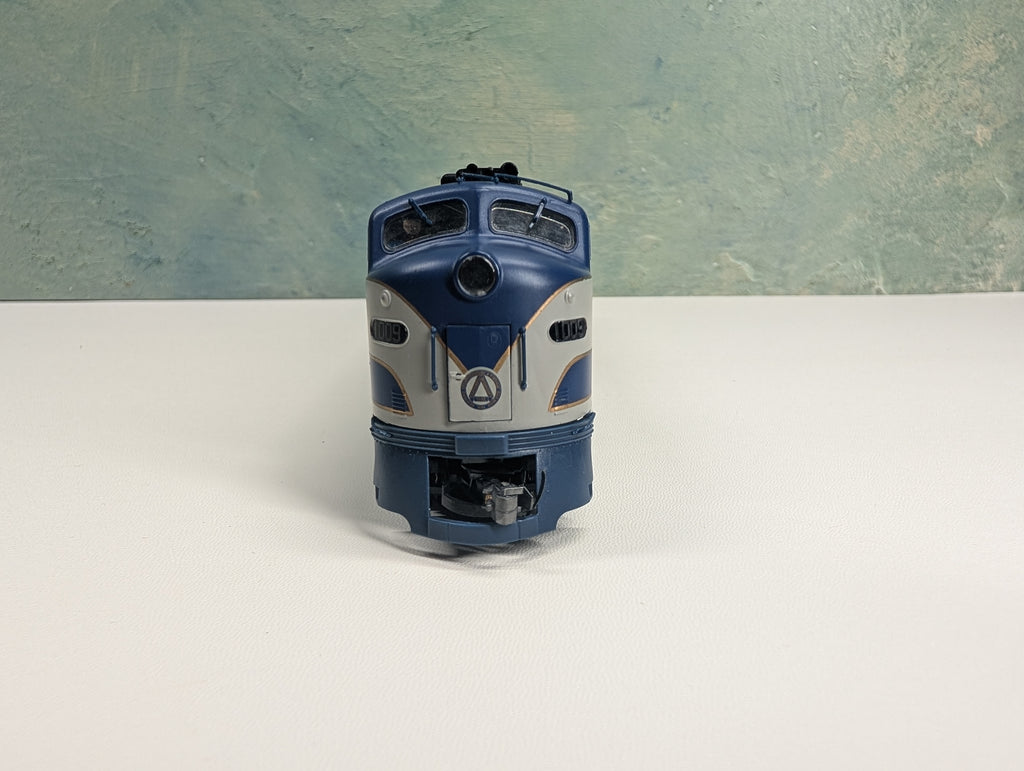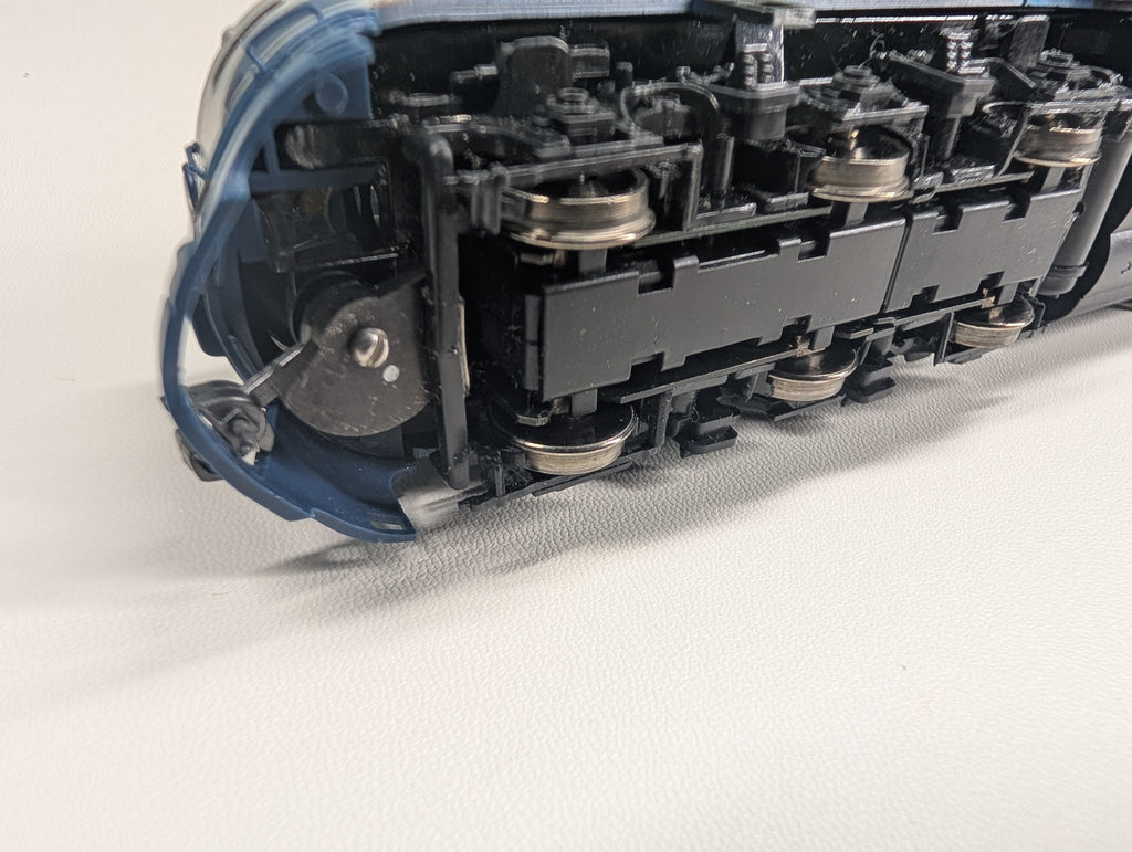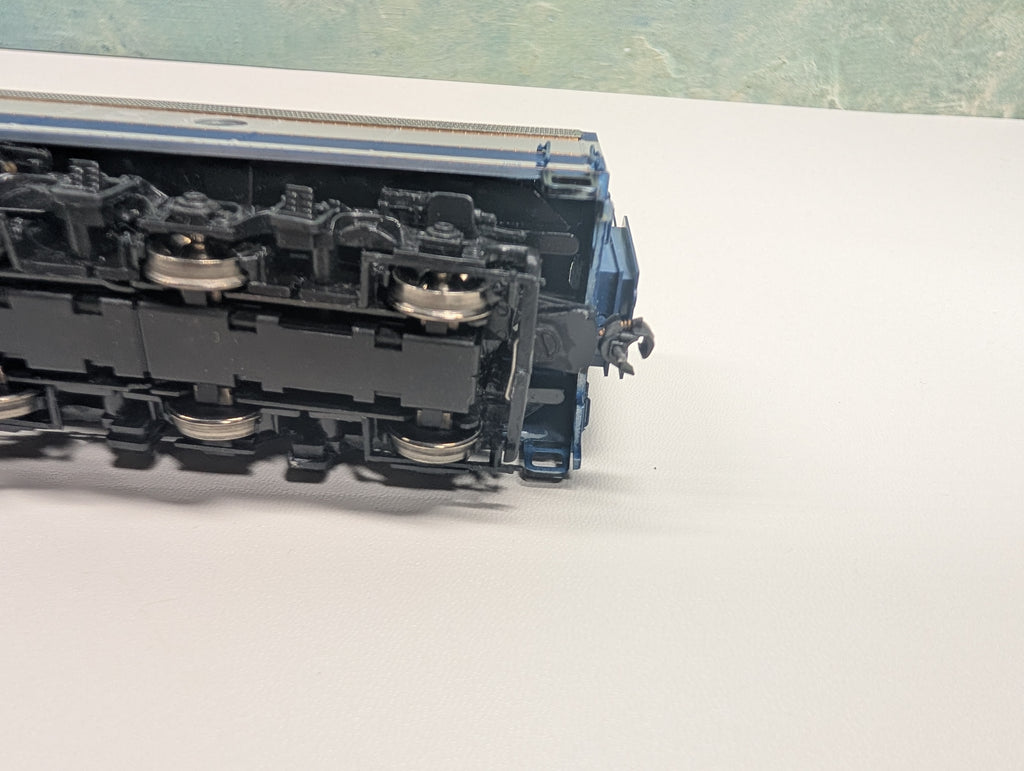 Has a Digitrax DH123 decoder. Was reset to address #3. Lighting works. Some of the very fragile details need repairs. The one middle door is slightly open and may need work to get it to close if that is an issue for you. Coupler trip pins are cut back. The front gearbox is wiggly but we tried to tighten it and it seems fine. Does not include box. May have paint wear/scratches/scuffs. Might require some light cleaning.