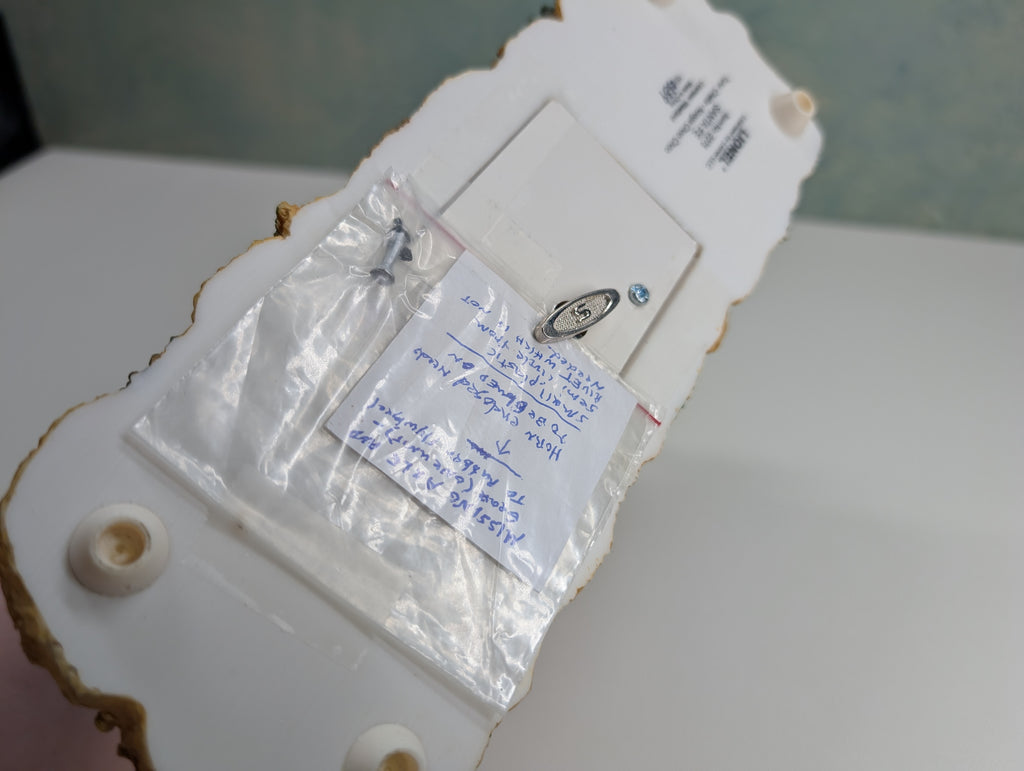 This is heavy. It nice overall condition. However, the one horn is included to be repaired. The music doesn't work. I don't know music boxes at all so I don't really know what is invovled to make it work. There are notes on the bottom of this pieces from the previous owner that may be helpful. Box with insert included. May have paint wear/scratches/scuffs. Might require some light cleaning.