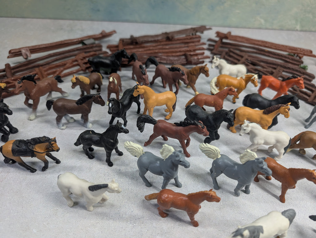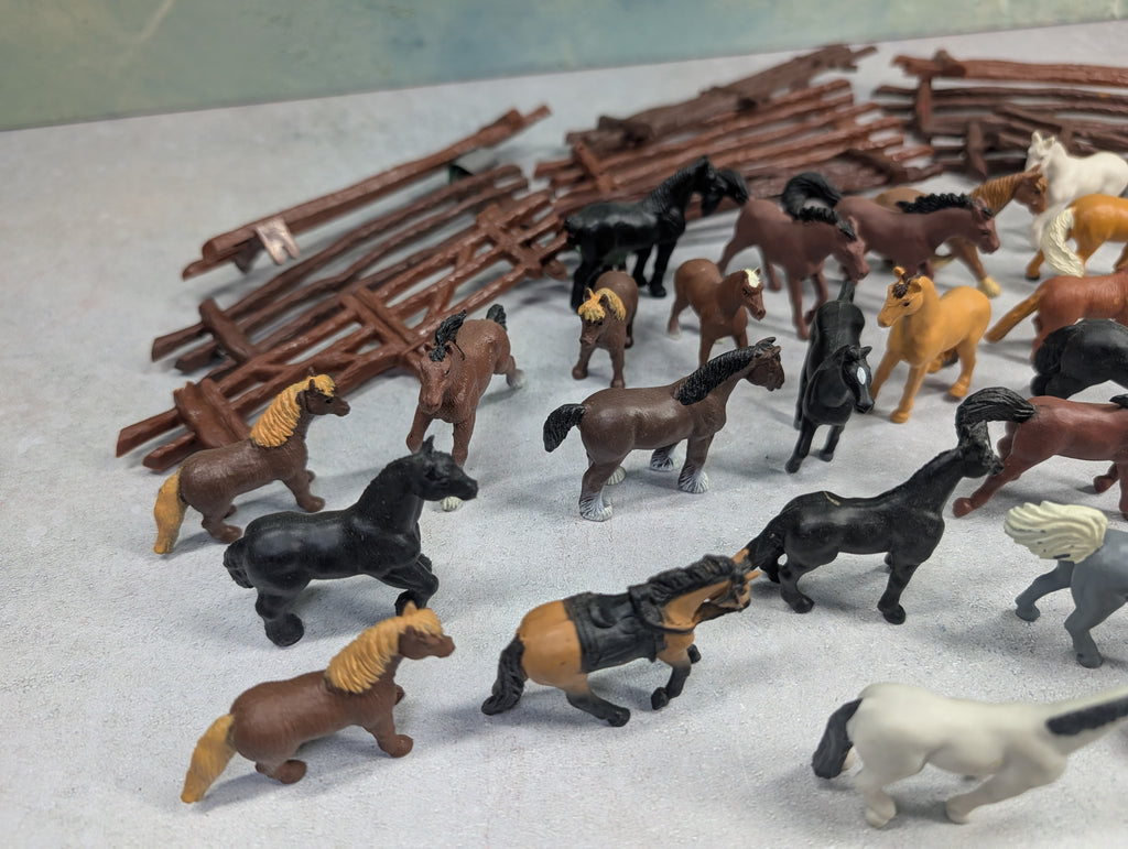 In nice condition. These came off a layout so the fencing may have some layout residue on the bottom of them. Would be a nice scene on your layout! 47 horses + 11 fence pieces. These are all O but they are various sizes. Some horses are smaller than others. Some paint wear/scratches/scuffs. Might require some light cleaning.