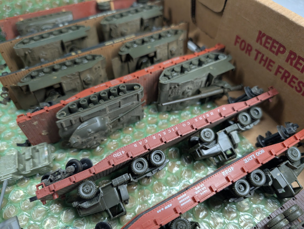 Various types, parts and pieces. Some are Mini Tanks, some are not and may not be HO. Some pieces may be damaged or are missing pieces. Some tanks/vehicles are attached to flat cars. May have paint wear/scratches/scuffs. Might require some light cleaning.