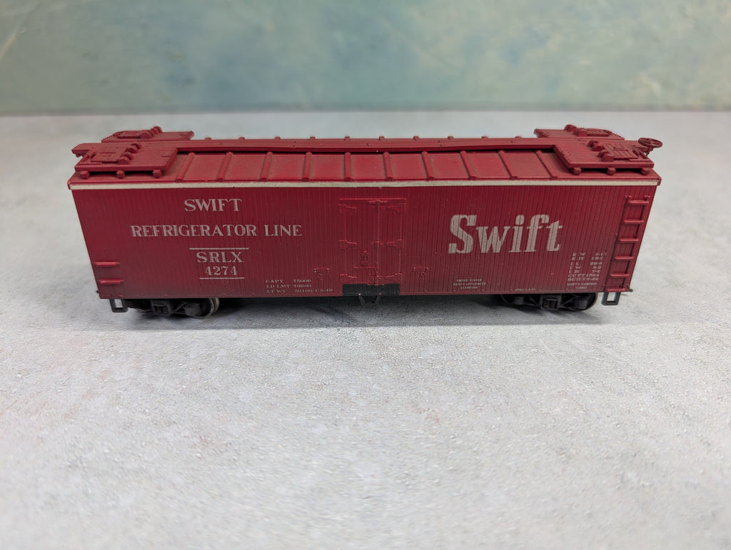 In really nice condition. The weathering looks great! Has metal wheels & knuckle couplers. Some paint wear/scratches/scuffs. Might require some light cleaning.