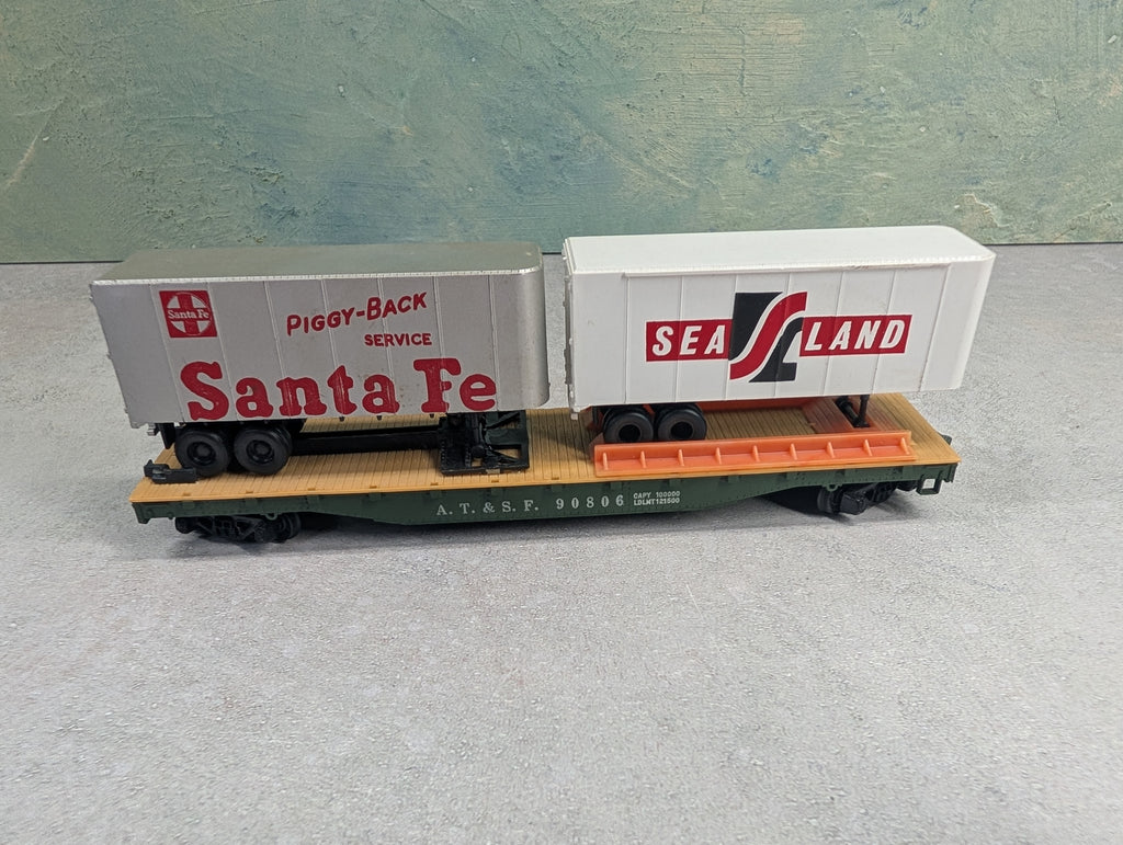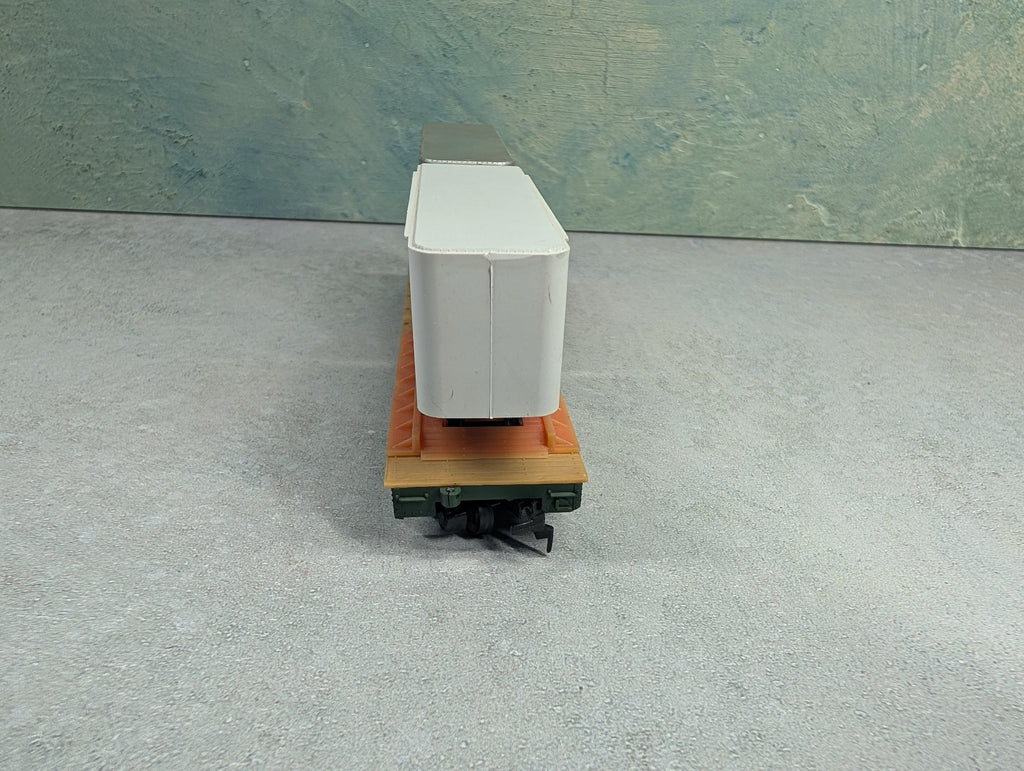 Missing steps and the brake wheel, otherwise great condition. The one trailer is glued on and the other is not. Some paint wear/scratches/scuffs. Might require some light cleaning.