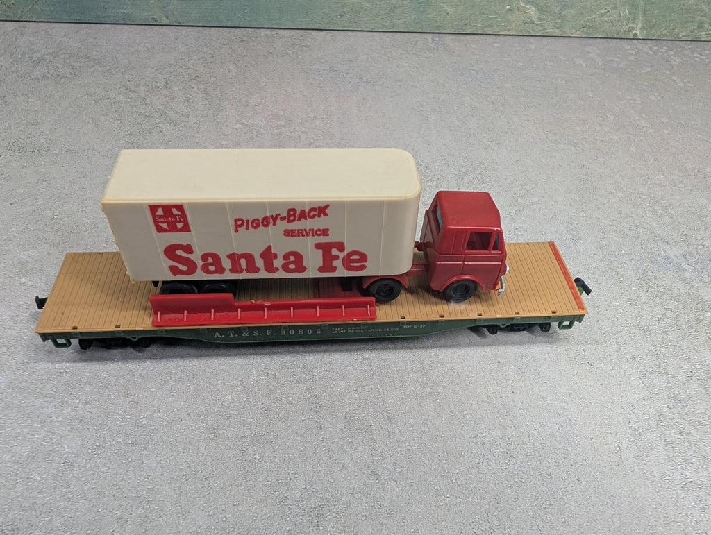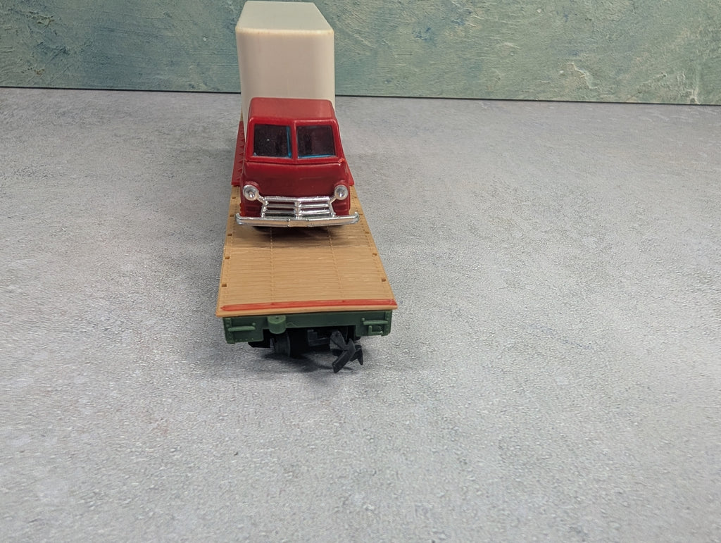 In nice condition. No brake wheel. Trailer and truck are glued to flat car. Some paint wear/scratches/scuffs. Might require some light cleaning.