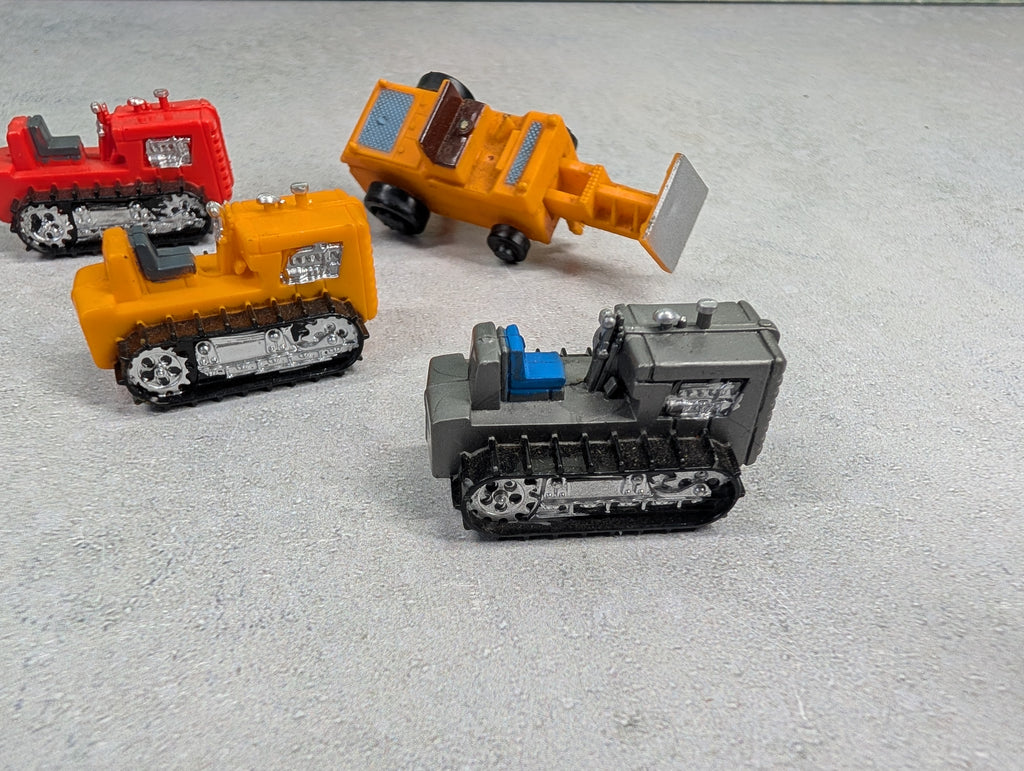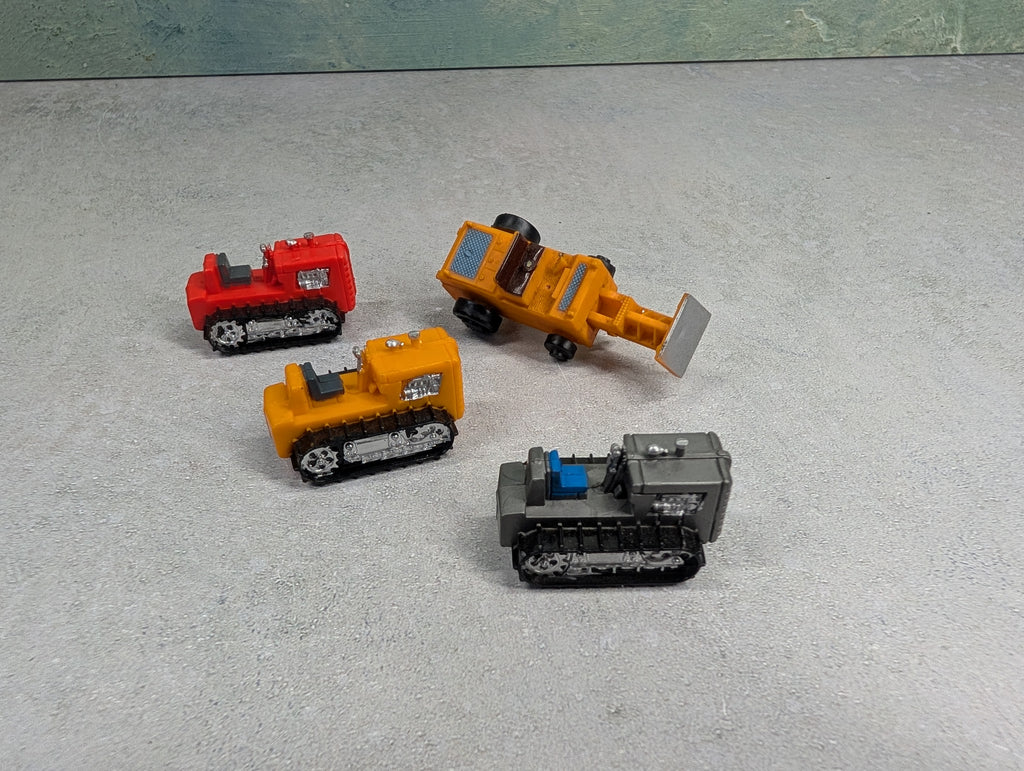 The 3 tractors are tyco. In nice condition. Some paint wear/scratches/scuffs. Might require some light cleaning.
