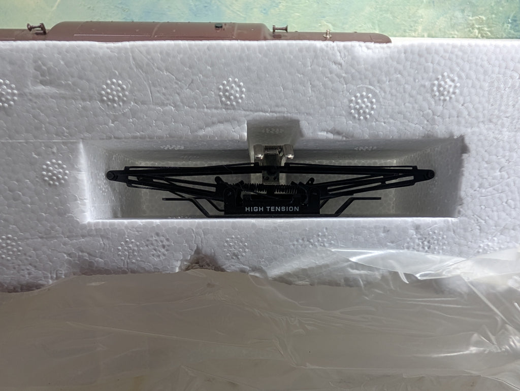 Tested and runs well, lights work and sound works. In good cosmetic condition. The pantographs are included to be installed. Window panes fell off and are inside the locomotive. Box with insert included. May have paint wear/scratches/scuffs. Might require some light cleaning.