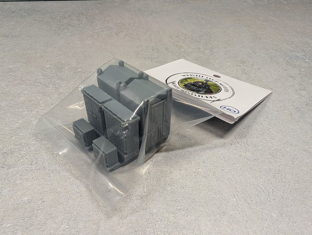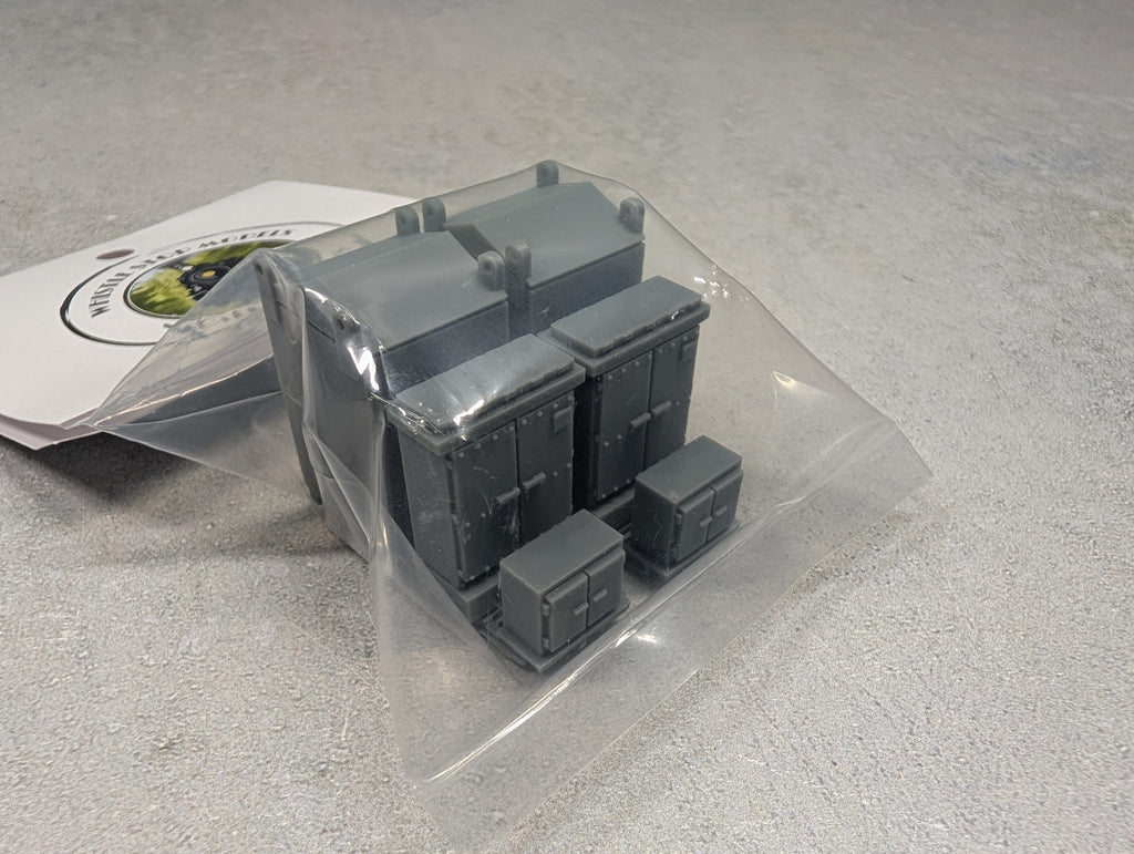 This is a set of (6) 3D resin printed electrical control boxes that you would see along the track for crossing controls, signal controls, and maintenance systems.