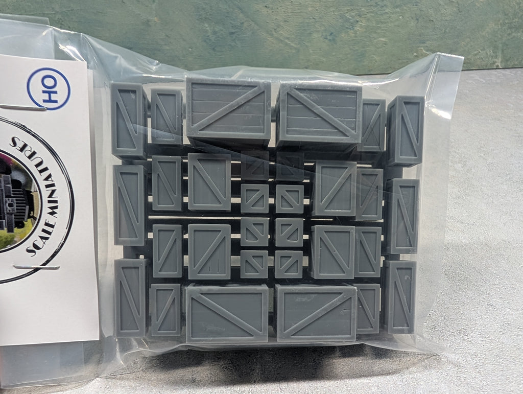 Set of 30 3D resin printed crates that you can add as freight for car loads, station platform details, industrial details or just in a pile of junk somewhere. Basic details that we all need!