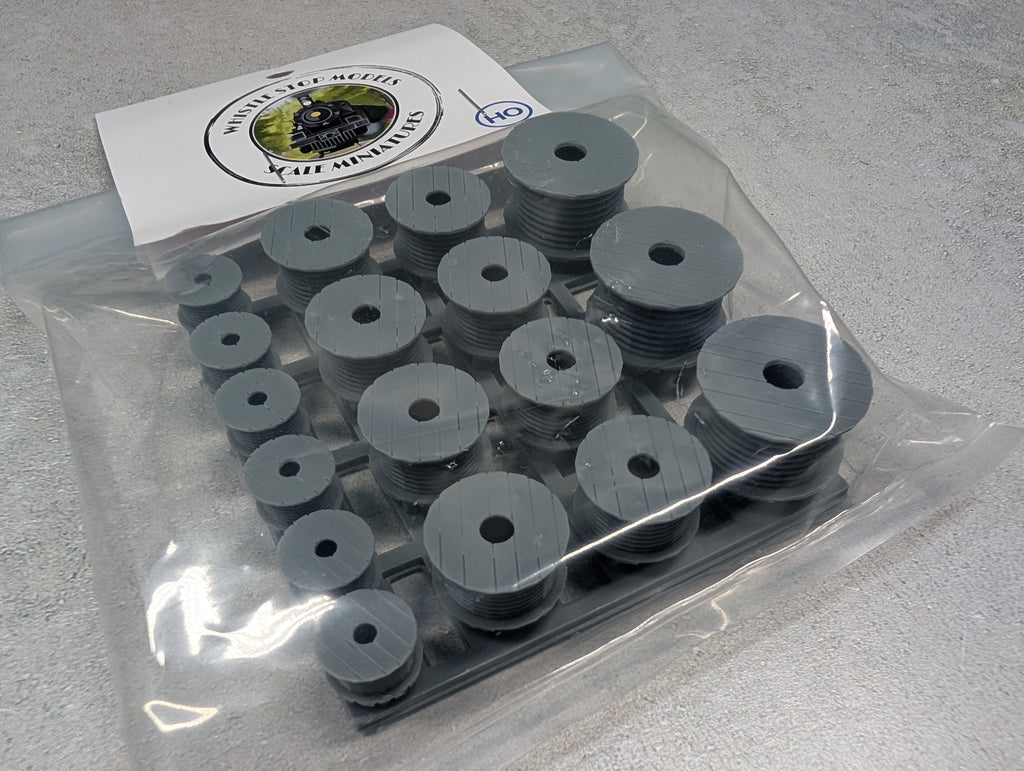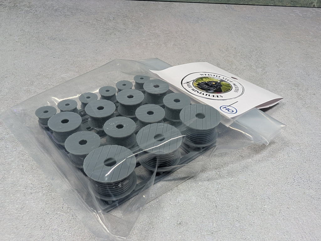 These HO-Scale Small Cable Spools are 3D resin printed, high detail models. But as resin is delicate, if they do break all you have to do is use thick super glue to put them together again – but I’m sure you already know that being an hobbiest like you are!