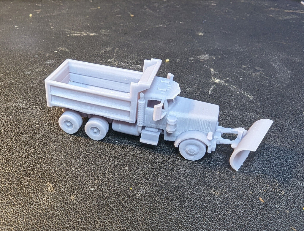 A N-Scale large tandem dump truck with a snow plow attachment.