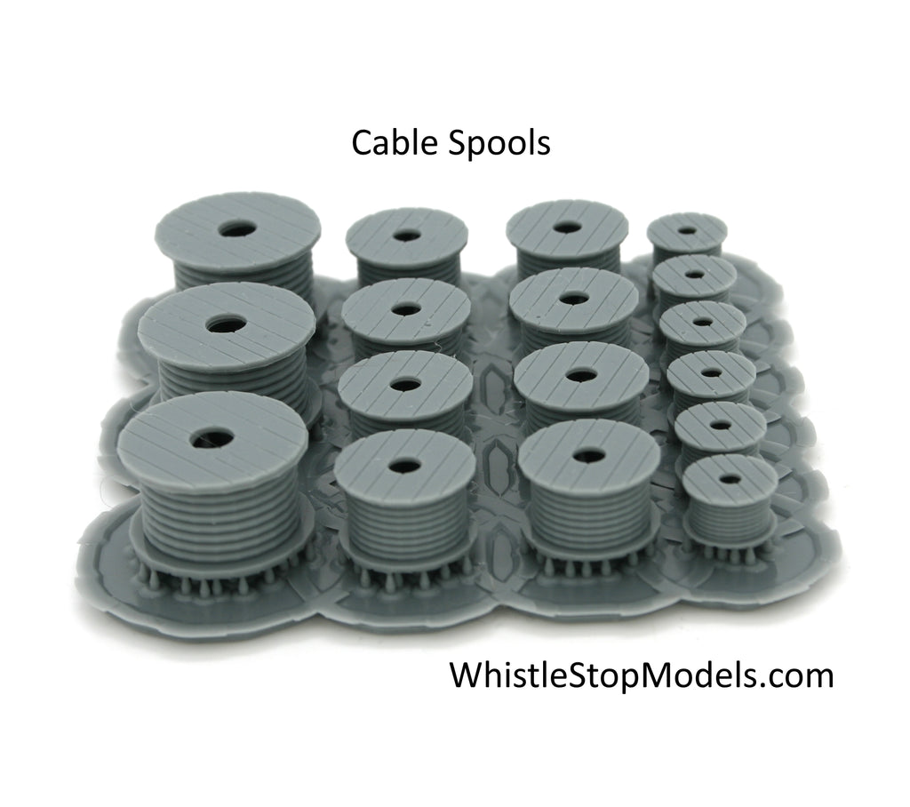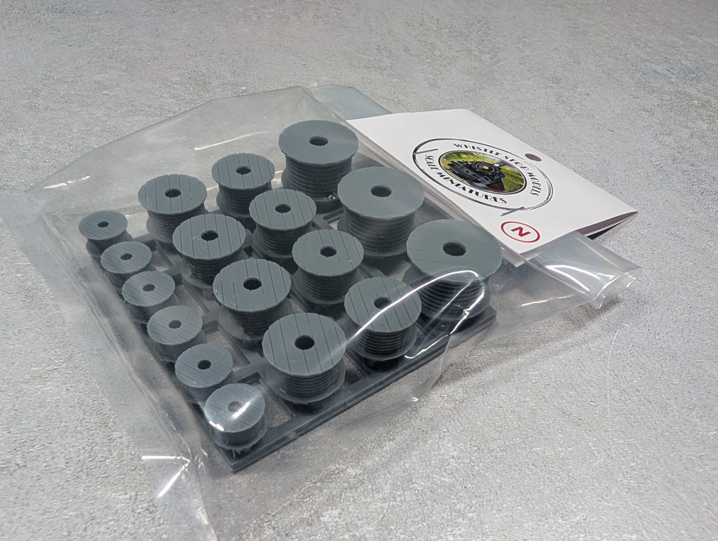 These N-Scale Large Cable Spools are 3D resin printed, high detail models. But as resin is delicate, if they do break all you have to do is use thick super glue to put them together again – but I’m sure you already know that being an hobbiest like you are!