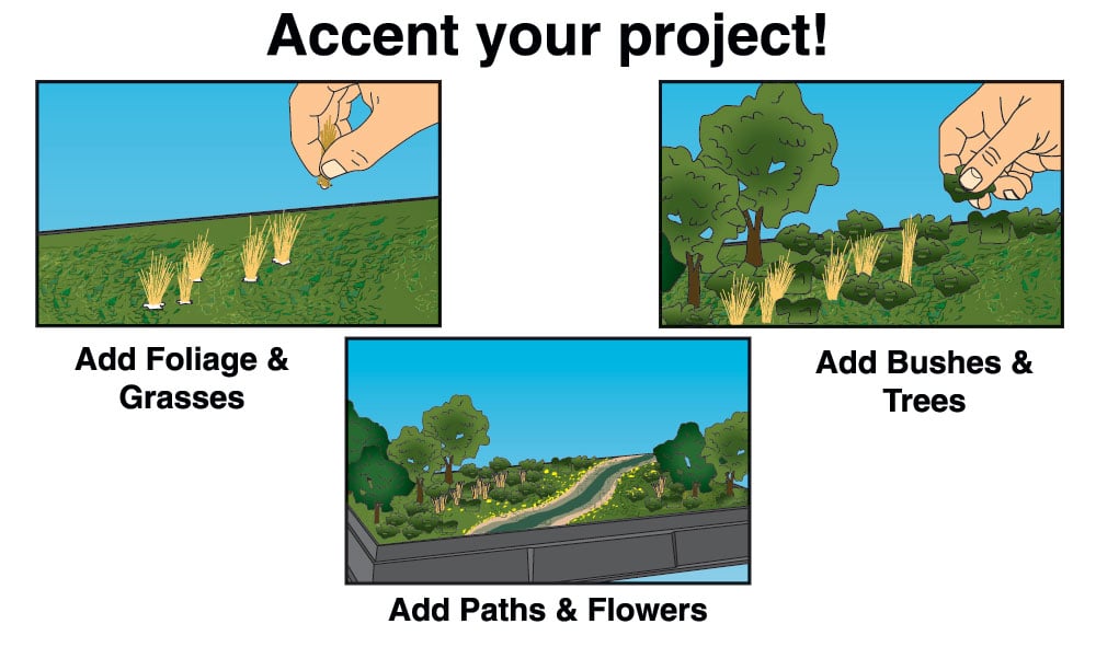Create short and tall grasses, weeds, bushes, shrubs, hedges, ivy or flowering plants. You can also make roads and paths.